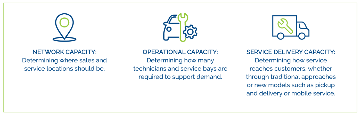 As networks evolve and aftersales expectations remain high, capacity planning—the process of determining the optimal service department infrastructure—has become a strategic imperative for legacy brands and new entrants alike. Capacity planning provides the foundation for an accessible, convenient service network by tailoring service infrastructure to both current and projected demand.